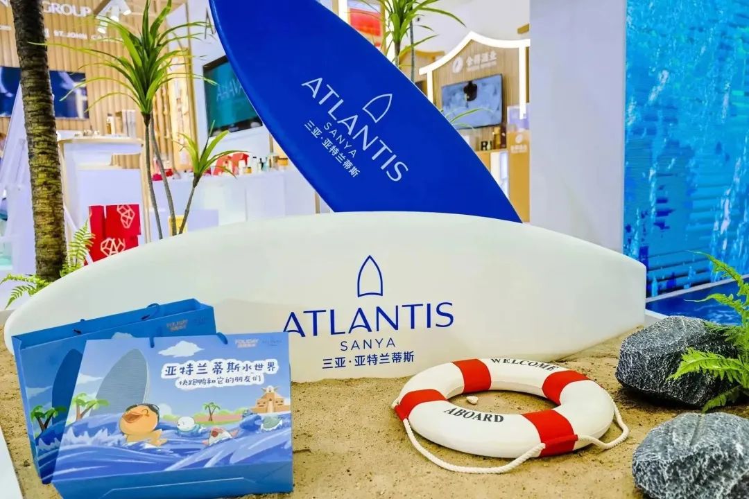 三亚·亚特兰蒂斯以其经典的蓝白配色,吸睛无数。在展会现场,首先映入眼帘的是度假区独具标志性的“风帆”主楼造型,“沙滩”周围则摆放着同色系的太阳伞、沙滩椅、冲浪板、游泳圈,搭配椰树、海星、木质路牌等景观造型。浓郁的热带风情,让中国南海的休闲度假气息扑面而来。4月28日,三亚·亚特兰蒂斯将迎来开业五周年的重要节点,本次展会上将围绕“娱乐亲子双重精彩 环球美食一站直达”两大核心战略,展示多业态产品的迭代更新。