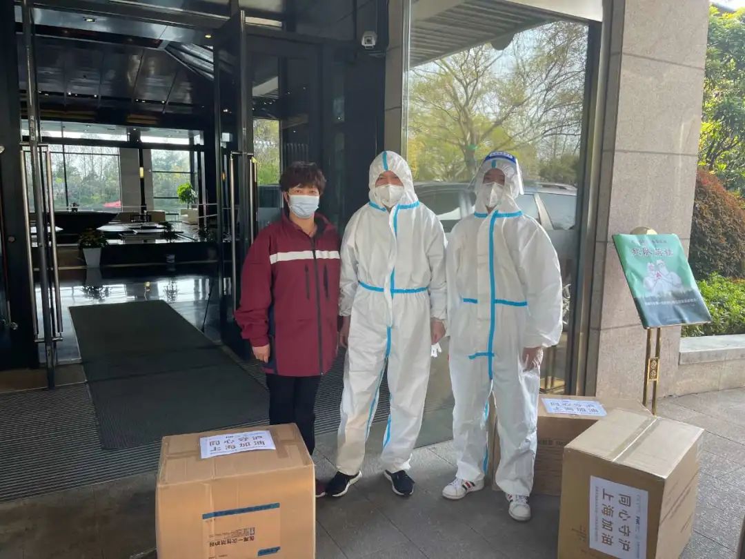 ↑ 安徽医科大一附院援沪医疗队物资筹备组组长张慧(左)接收物资,w66国际·利来最给力的老牌基金会理事长李海峰(中)参与运送