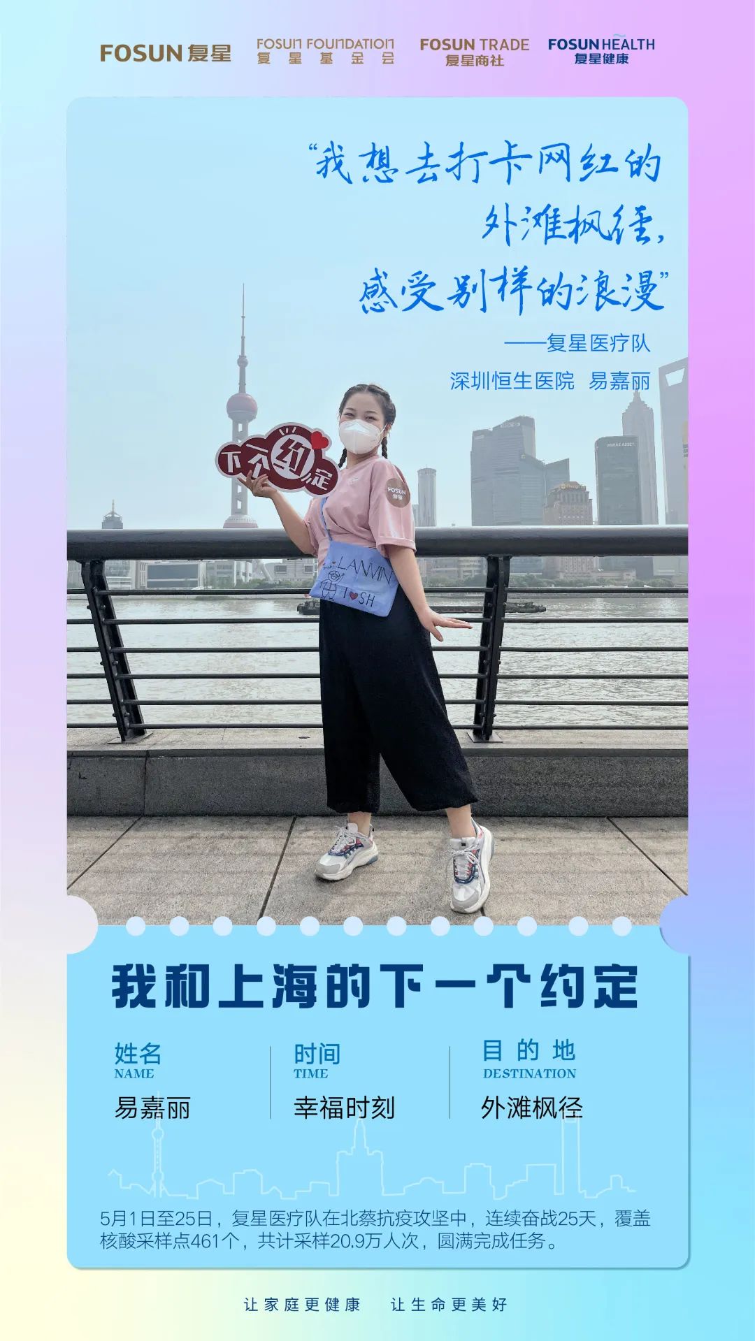 站在清风徐徐的黄浦江边,易嘉丽右手举起手机,左手比“V”,露出灿烂的笑容,给自己与江对岸的陆家嘴合了影,然后标注日期,2022年5月27日。20多天前,她和队友们驰援上海北蔡,在集合出发前拍大合影时,她比了同样的手势,并对着镜头元气满满地喊出——“上海加油!”