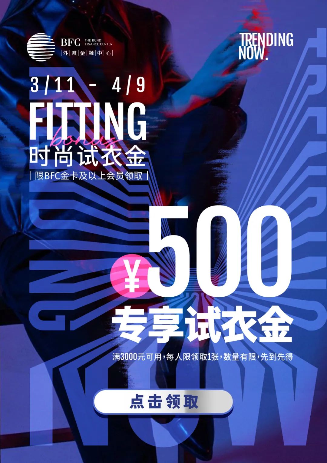 进店试衣,竟然能拿500元试衣金?作为BFC时尚季的另一重磅惊喜,扫描上方海报即可领取,每人限领一张,数量有限,先到先得!(注:本活动仅针对金卡及其以上会员,具体收券品牌以电子券说明为准)