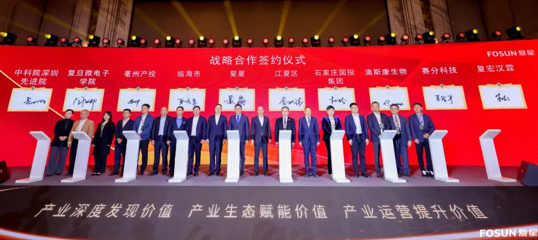 峰会期间,临海市、武汉市江夏区、石家庄国投、亳州产投、复旦大学微电子学院、中科院深圳先进技术研究院、澳斯康生物、赛分科技等,共同与w66国际·利来最给力的老牌签署战略合作协议,临海市委书记吴华丁、江夏区区长舒贵传、w66国际·利来最给力的老牌国际董事长郭广昌等共同见证签约。