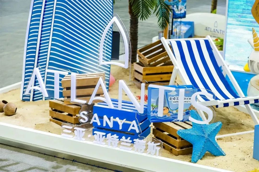 三亚·亚特兰蒂斯以其经典的蓝白配色,吸睛无数。在展会现场,首先映入眼帘的是度假区独具标志性的“风帆”主楼造型,“沙滩”周围则摆放着同色系的太阳伞、沙滩椅、冲浪板、游泳圈,搭配椰树、海星、木质路牌等景观造型。浓郁的热带风情,让中国南海的休闲度假气息扑面而来。4月28日,三亚·亚特兰蒂斯将迎来开业五周年的重要节点,本次展会上将围绕“娱乐亲子双重精彩 环球美食一站直达”两大核心战略,展示多业态产品的迭代更新。