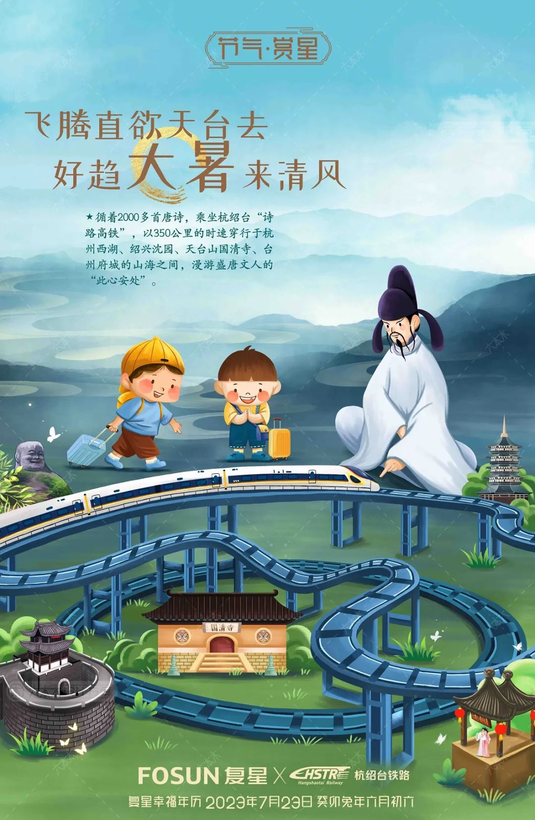 大人们皆谓暑热苦,孩子们却爱夏日长。暑假当然越长越好,而销暑自有妙招。比如乘坐杭绍台铁路,追随正在热映的《长安三万里》的浓浓诗意,读唐诗、说李白。