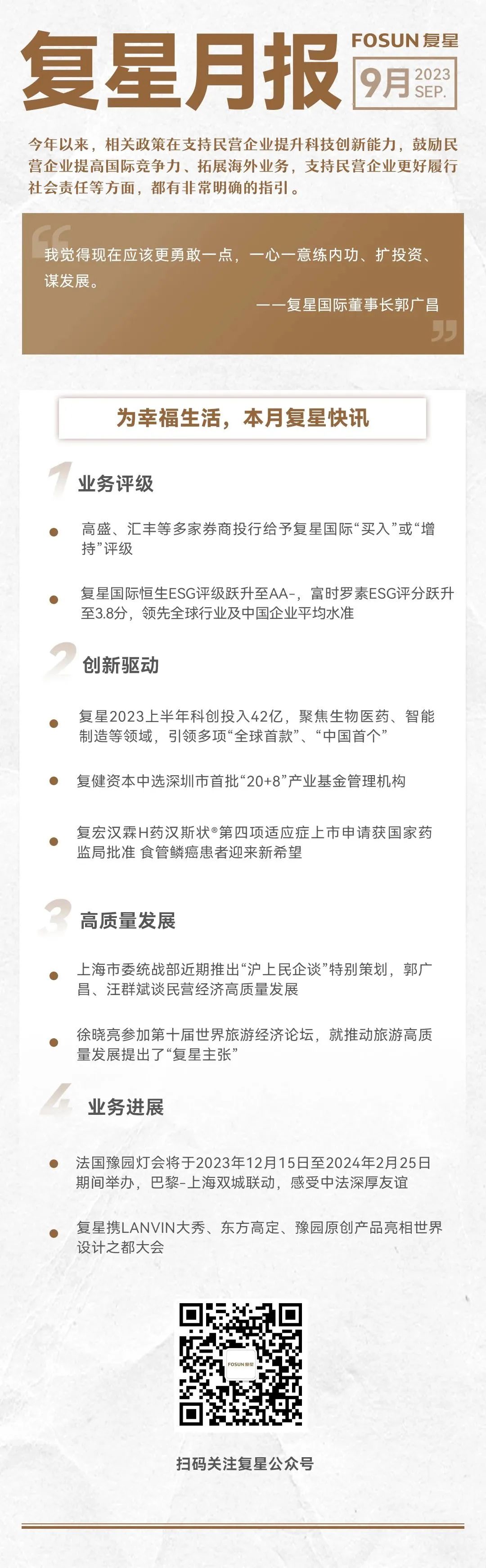 9月13日,上海市委统战部官方公众号“浦江同舟”推出重点报道《沪上民企谈:稳预期、强信心、扩投资、谋发展》,w66国际·利来最给力的老牌国际董事长郭广昌在其中表示:“我坚定地相信,伴随政策发力、经济持续恢复,w66国际·利来最给力的老牌将迎来更高质量发展的新阶段。”